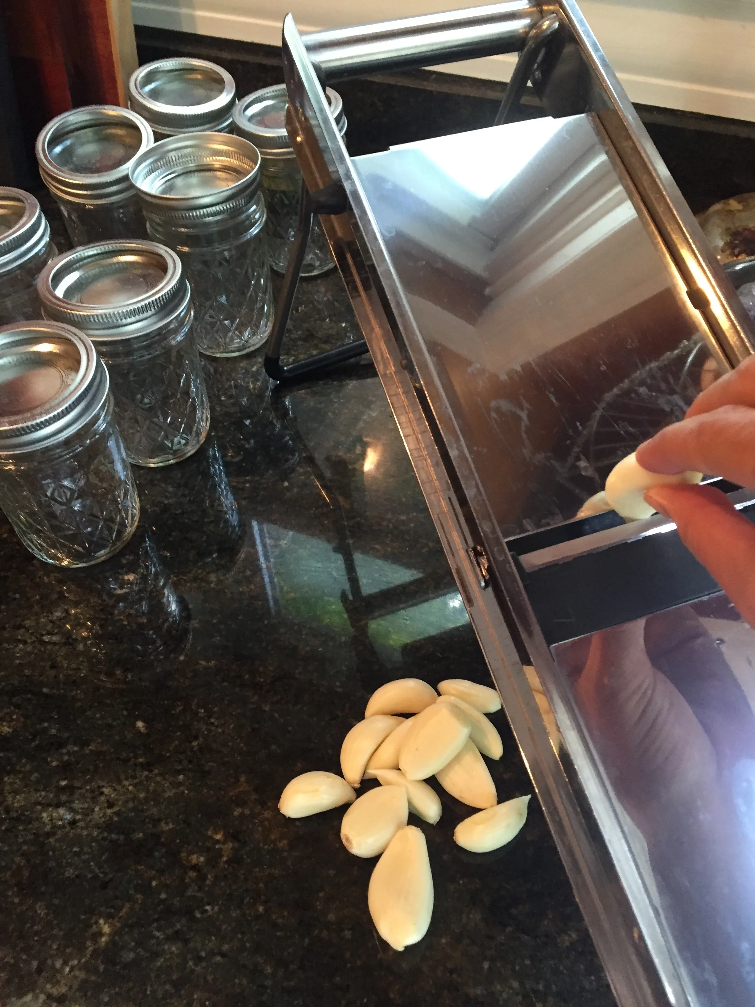 Next, thinly slice your garlic and cover the bottom of the jar. It takes 2-4 cloves per large jar and 1-2 cloves per small jar depending on the size of the clove! Feel free to skip if you do not like garlic.