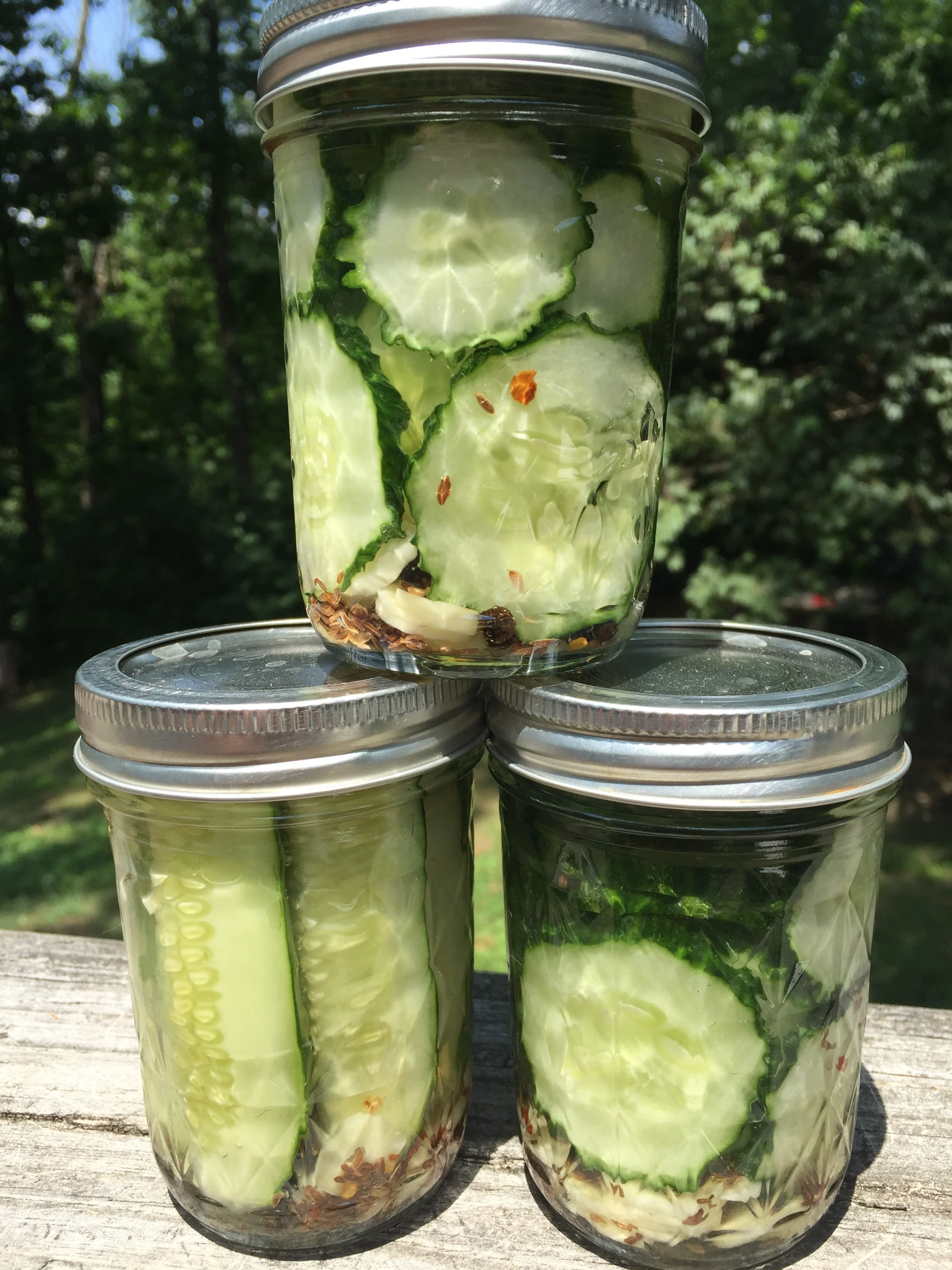 Viola! It's THAT easy! No boiling jars... They make wonderful gifts and taste delicious! These crispy cunchy pickles will leave you craving more with their salty sour taste that is beautifully balanced with a hint of sweet and spicy. They are great as a refreshing cool summer snack on their own or paired with a nice mellow cheese such as gouda.  They are perfect on any sandwich. You can also chop and add them to your egg salad, chickpea salad or pasta salad.  Save the brine and use it for dressings! The jar will be gone in no time at all!